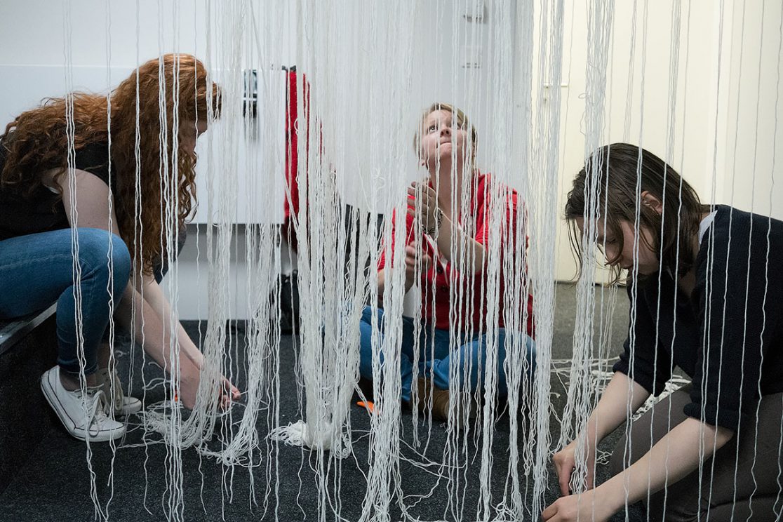 Das Hamburger Regen-Modell: Die Lichter der Straßenlaternen wollten wir nutzen, um bei Regen eine zeitbegrenzte Skulptur zu formen. Wir hatten die Idee von einem interaktiven Stadtphänomen: Twitter- oder SMS-Nachrichten sollten in den Regen gesendet werden. Für die Umsetzung im Raum wurde der Regen durch Fäden ersetzt und mit einer Projektion beleuchtet. (Lea Pürling, Annette Schmid, Leonie Langer, Antonia Rodriguez und Hannah Göppel)